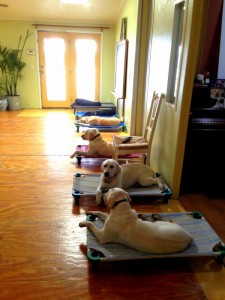 Six dogs on six placeboards learning impulse control at BLSD’s Obedience Board & Train program